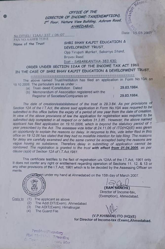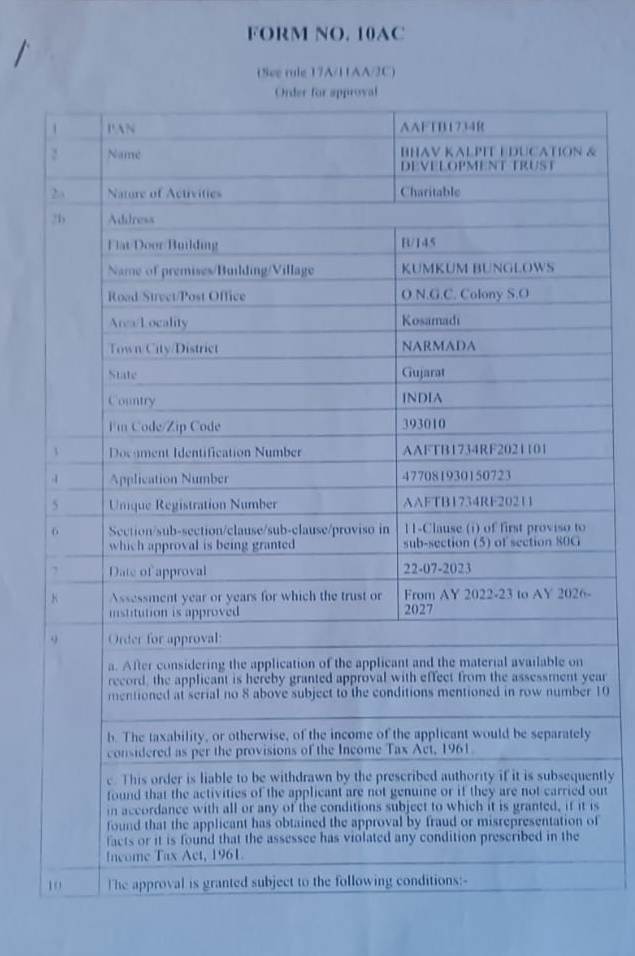 (20/3/2014) FCRA 167 . FORM NO. 10AC FROM YEAR ૨૦૨૨ – ૨૦૨૩ to ૨૦૨૬ – ૨૦૨૮.